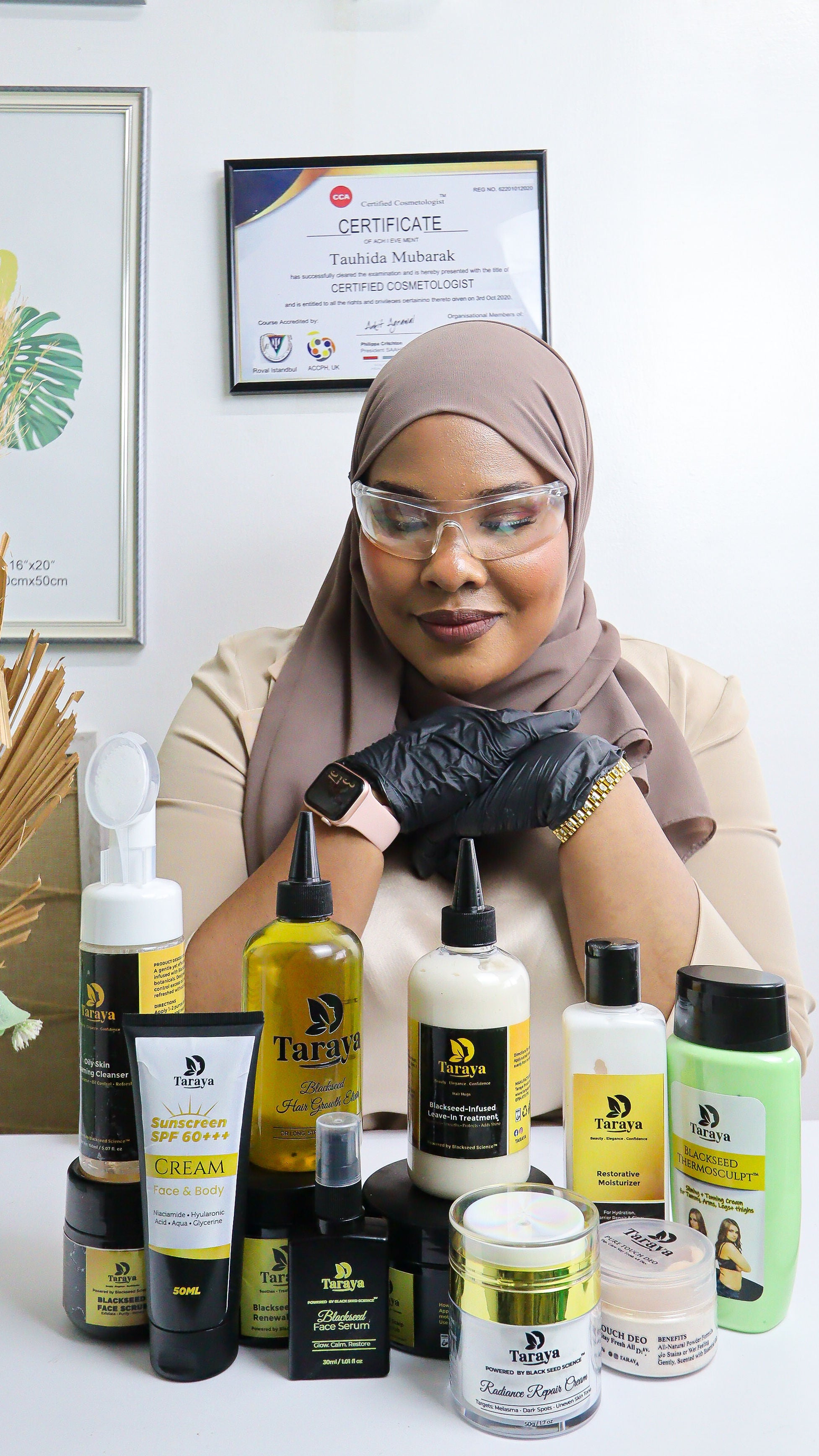 Dr. Tauhida is the founder and visionary behind Taraya, a leading beauty and skincare brand built on the principles of natural healing, innovation, and excellence in aesthetic care. Through Taraya, she has introduced a unique approach to skincare that blends time-honored botanical ingredients—most notably blackseed (Nigella sativa)—with modern cosmetic formulation and aesthetic practices.